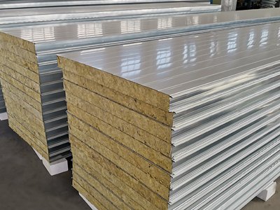 巖棉彩鋼夾芯板其上下表面采用鍍鋅彩色鋼板或鍍鋁鋅彩色鋼板,厚度為0.4-0.8mm。通過自動化連續(xù)成型機(jī),經(jīng)壓型后用高強(qiáng)粘合劑粘合而成。巖棉塊交錯鋪設(shè),其纖維走向垂直于巖棉彩鋼夾芯板的上下表面,并緊密相接充實(shí)了巖棉彩鋼瓦的整個(gè)縱橫截面。巖棉塊之間和域名與上、下層鋼板之間通過高強(qiáng)度發(fā)泡劑粘接復(fù)合而成。巖棉彩鋼瓦有很強(qiáng)的剛度,具有防火、保溫、隔音等性能。